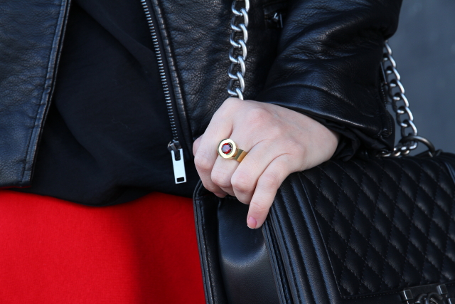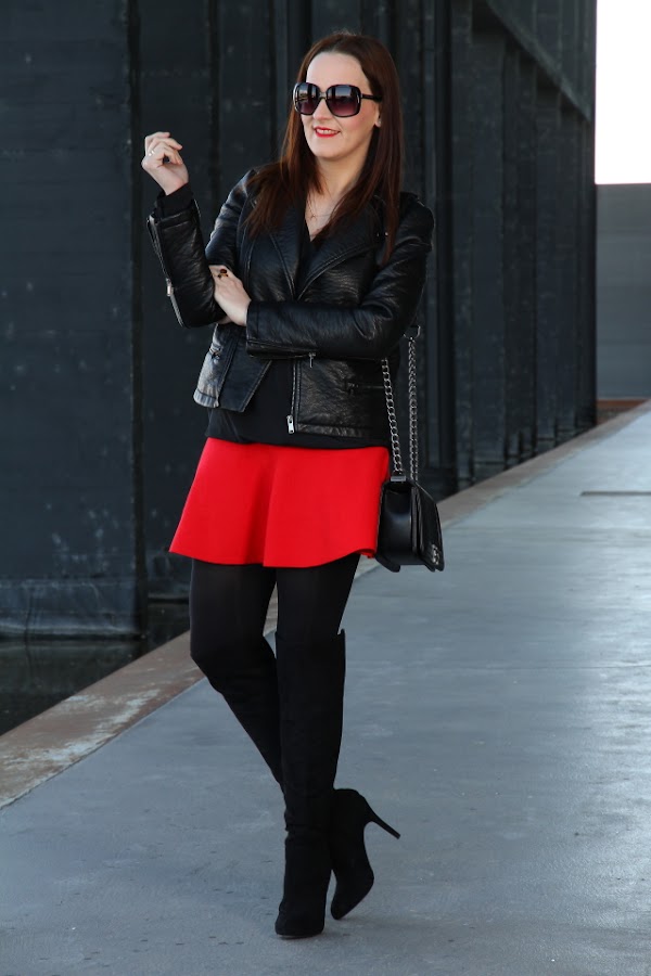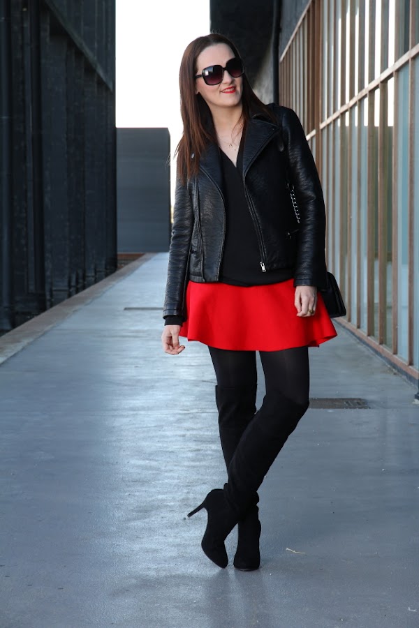 Me compré esta falda roja por el color tan bonito que tiene, pero es que ahora que la tengo, cada vez que me la pongo me gusta más por la fuerza que transmite a los estilismos. Un ejemplo es el outfit de hoy en el que le he dejado todo el protagonismo llevándola con un total look negro con biker y botas mosqueteras.