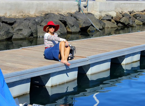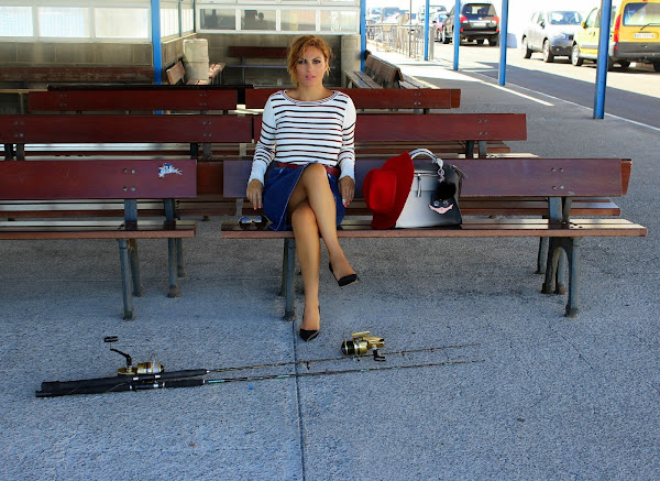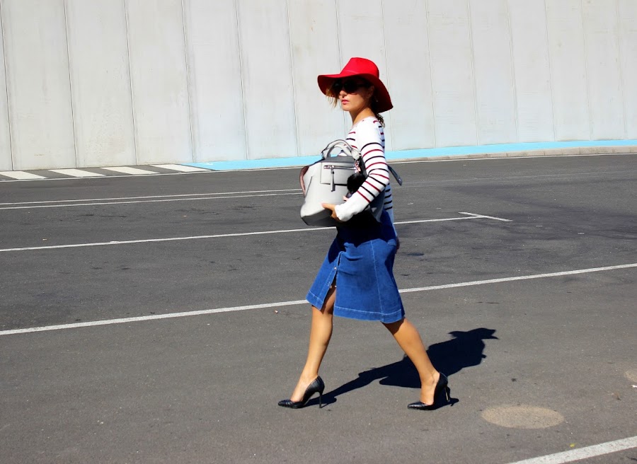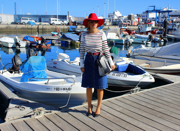 El look de hoy destaca por su sencilla elegancia, con una falda vaquera hasta la rodilla cerrada en la parte delantera con botones y un jersey a rayas inspirado en el estampado navy.