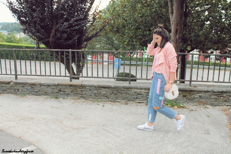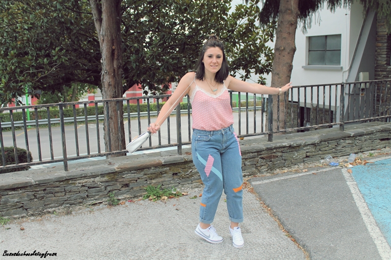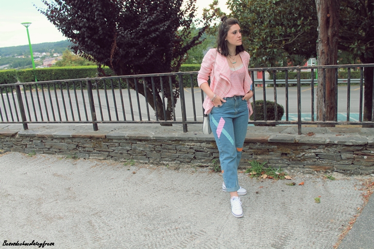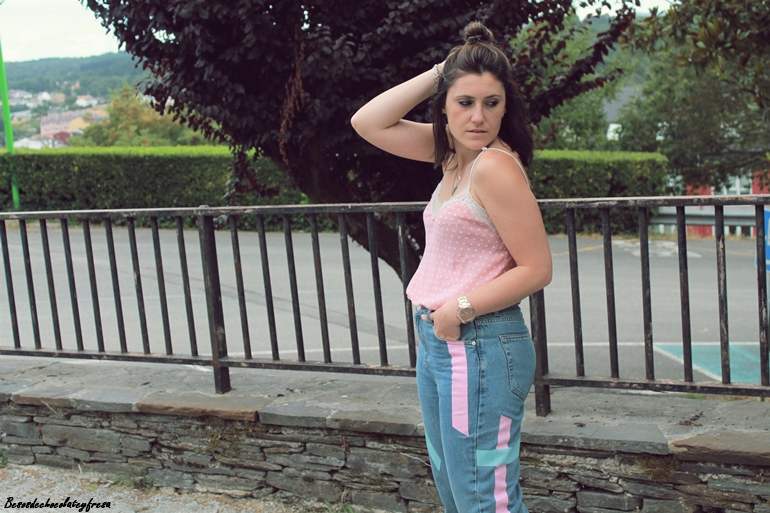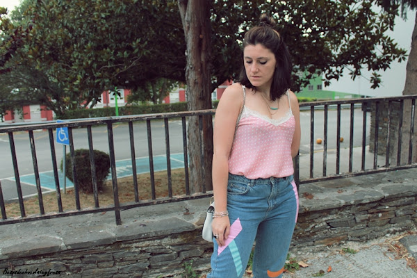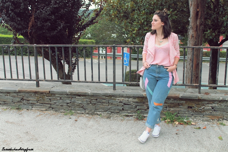 Los mom-jeans vuelven con fuerza y ante la curiosidad de esta tendencia, no me pude resistir cuando vi los pantalones que llevo en el outfit de hoy en Pull&Bear, que ahora podeis encontrar de rebajas. Además de los característico de los jeans tienen un añadido como son una serie de tiras de colores pintadas a mano en rosa, mint y naranja que lo hacen diferente, original y divertido.