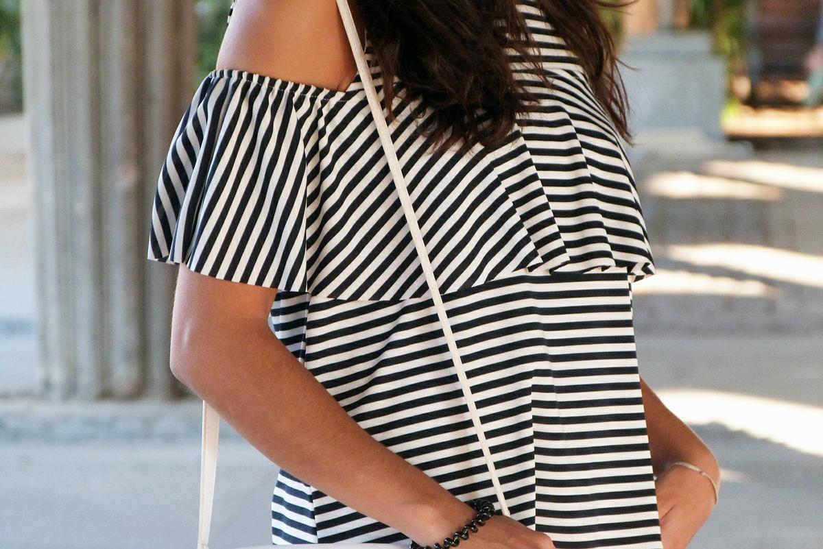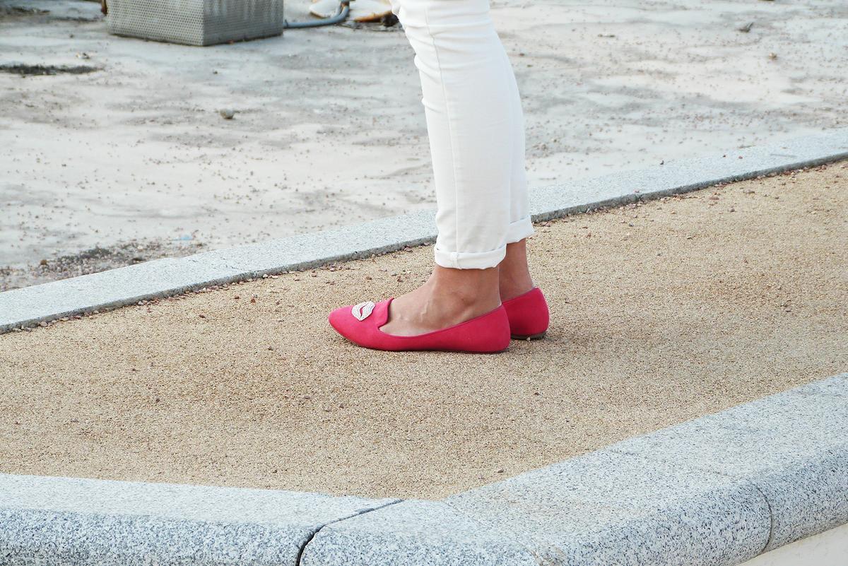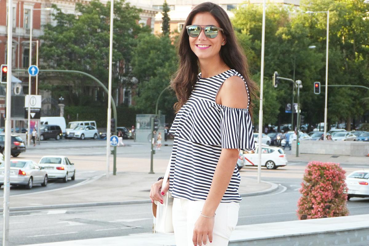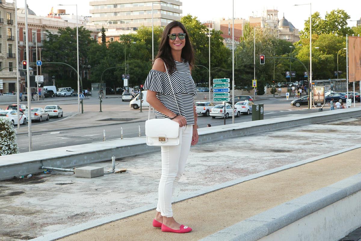 A Madrid ya ha llegado el tiempo otoñal. Tal vez el verano vuelve a sorprender en octubre como el año pasado (así que de momento nada de cambio de armario). Estos días nos toca ponernos looks de entretiempo. Yo suelo usar pantalones largos y camisetas con más manguita y menos veraniegas. En concreto, la camiseta del look de hoy me encanta porque me parece super original: combina las clásicas rayas con un diseño diferente, con un volante y con los hombros al aire. Aunque el complemento estrella del look son estas bailarinas fucsias de Justfab. Si no conocéis esta web os la recomiendo porque tienen cosas muy chulas y diferentes a muy buen precio. Además, al inscribirte en Justfab metes tus gustos y cada vez que entras te hace recomendaciones en función de tus preferencias. ¡Y acierta!