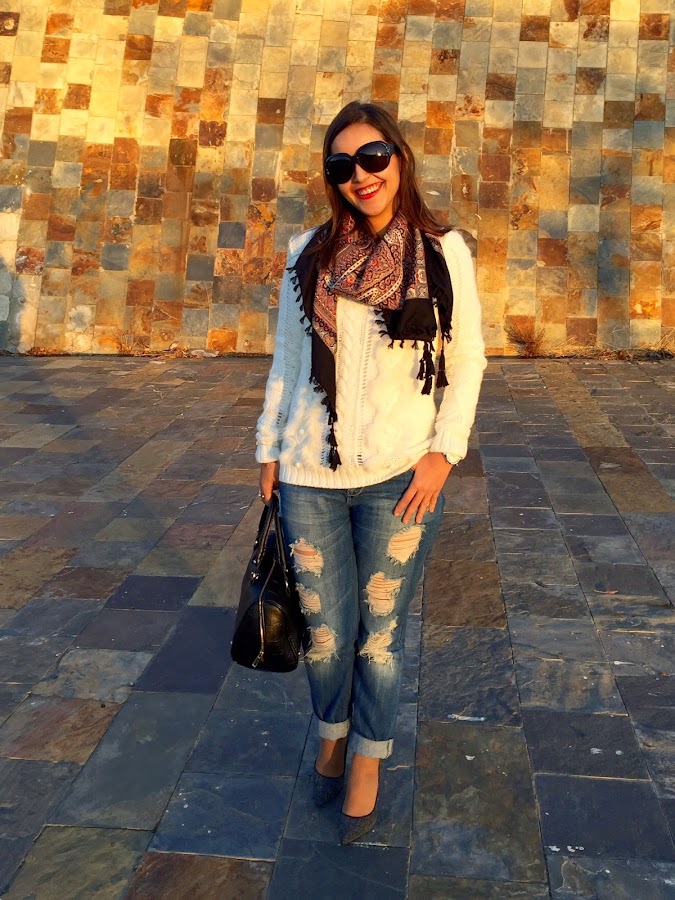 !Buenas noches amores! Empezamos nueva semana y espero y deseo que sea más tranquila que la anterior. Hoy os enseño un look sencillo, pero que me encanta. En él llevo boyfriend jeans y uno de mis jerseys favoritos de la temporada. Para darle un toque chic a este look tan sencillo, unos buenos tacones y uno de mis pañuelos favoritos.