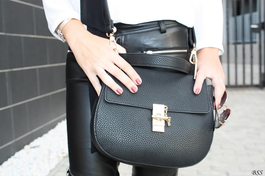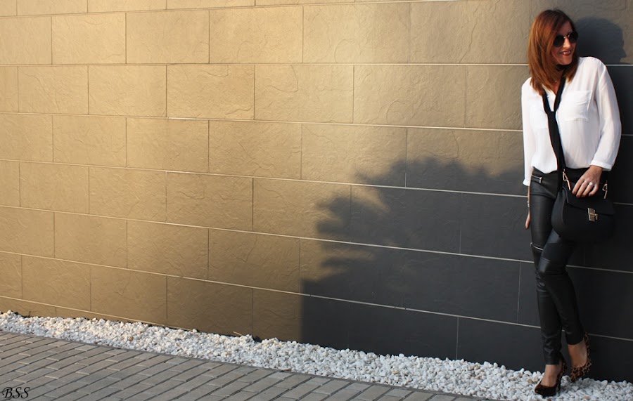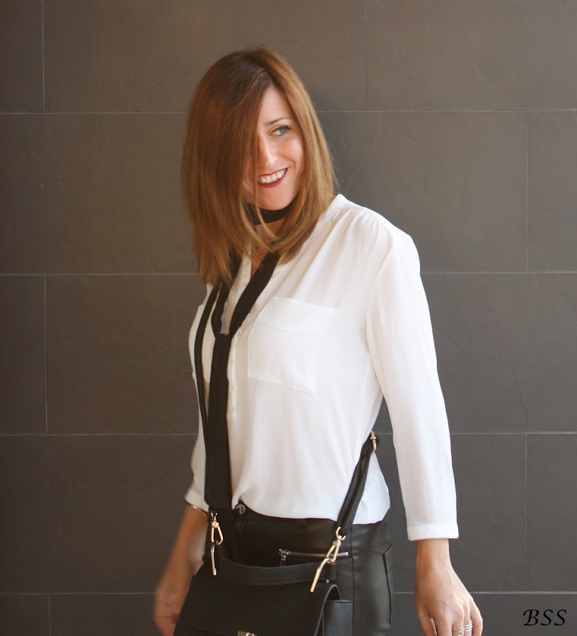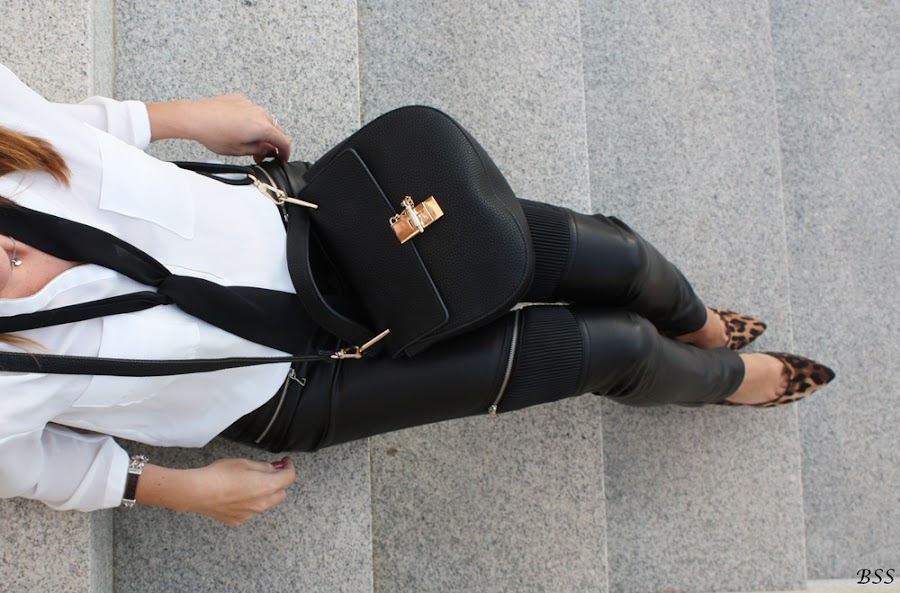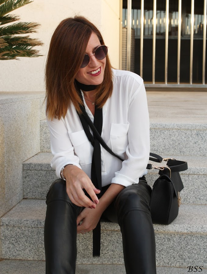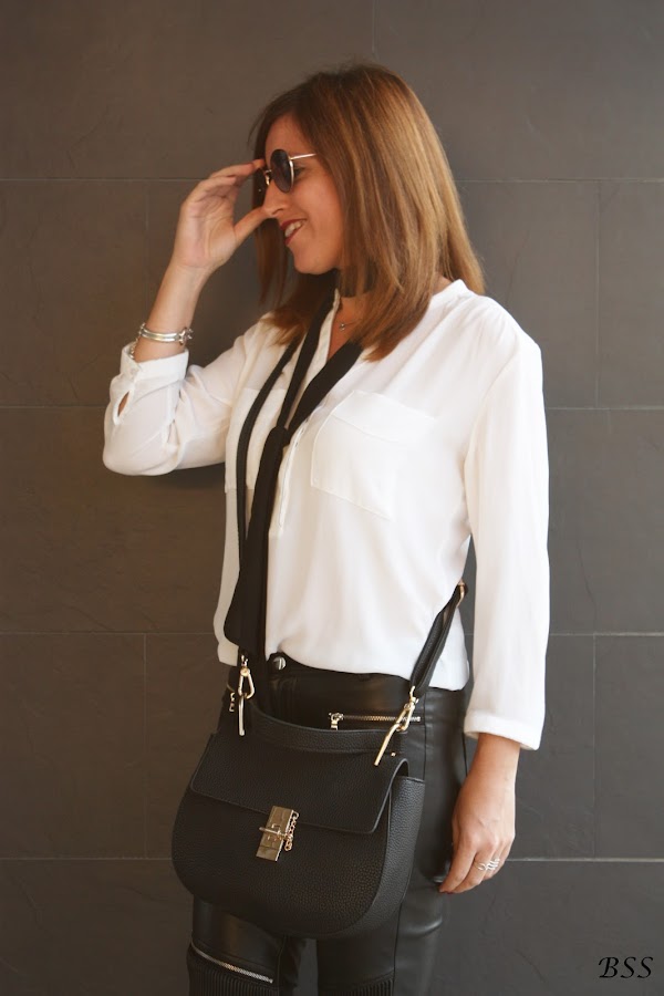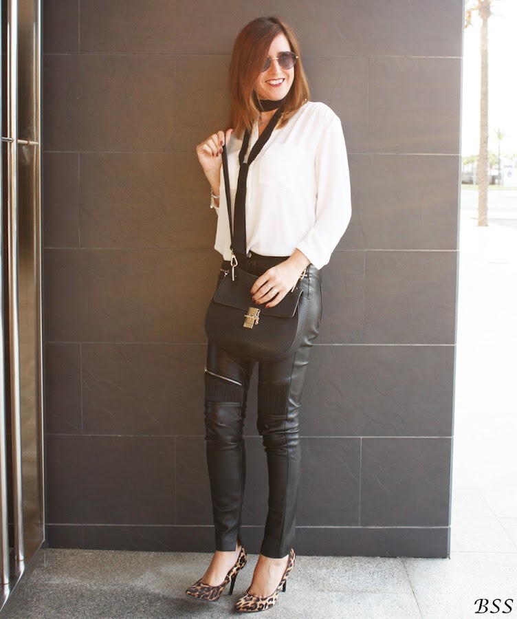 Esta vez a un look con pantalones de cuero y blusa holgada le he dado un toque distinto con un skinny scarve en color negro.