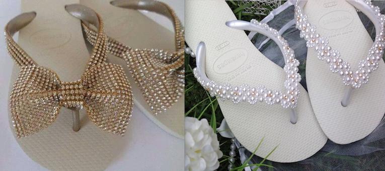 Es cada vez más común celebrar las bodas en una playa donde debemos caminar sobre la arena y además todo el ambiente que rodea el acontecimiento es natural y poco sofisticado, pero de todos modos no deja de ser una celebración de un aconteciento importante y donde, si quieres puedes darle un toque de elegancia a tu vestuario de esta informalidad. Una buena idea es adornar unas hawaianas o sandalias planas con perlas o piedrecitas y con poquísimo dinero le estarás dando un toque elegante y chic a tu look.