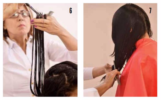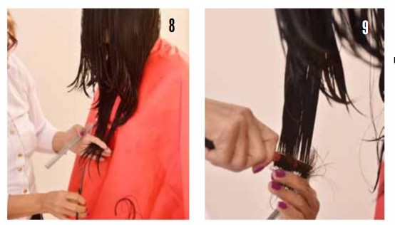 Toma la parte de atrás del cabello y divide en dos mitades. Con la tijera corta las puntas pero esta vez utiliza la punta de la tijera colocando la misma en línea recta a las puntas de cabello. De esta forma se empareja el corte.