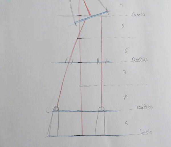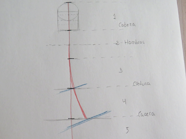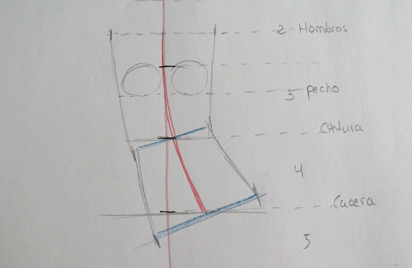 Las alturas están marcadas en azul: la línea de hombros va recta, y la línea de cadera y cintura van inclinadas en forma diagonal, acorde a la inclinación del eje central, la cintura no va tan inclinada ya que, si te fijas en la imagen, el eje en esa zona no es tan inclinado, mientras que en la cadera es más pronunciada esta inclinación. Date cuenta que, cuanto más inclinado esté el eje central, más lo estarán las líneas de cintura y cadera