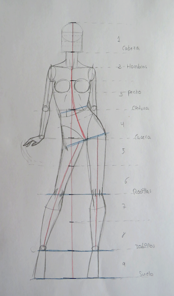 Dibujamos el eje central y lo dividimos en 9 cabezas