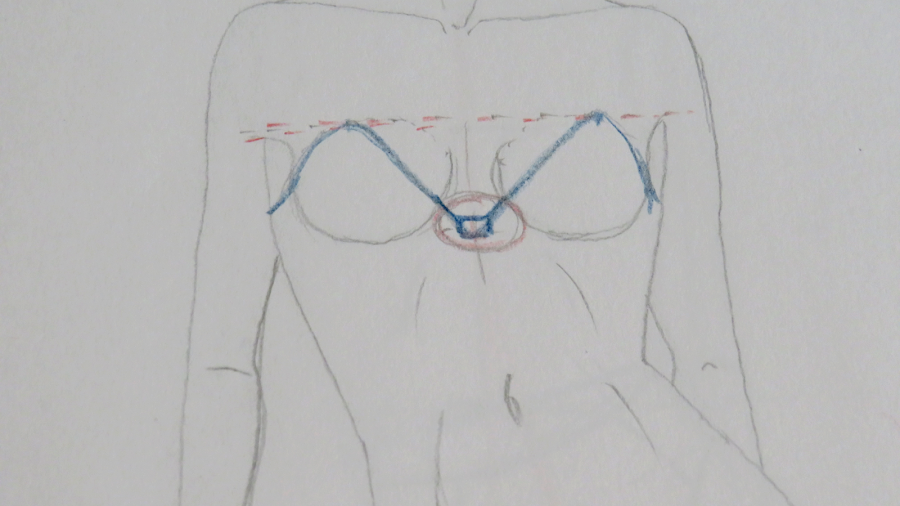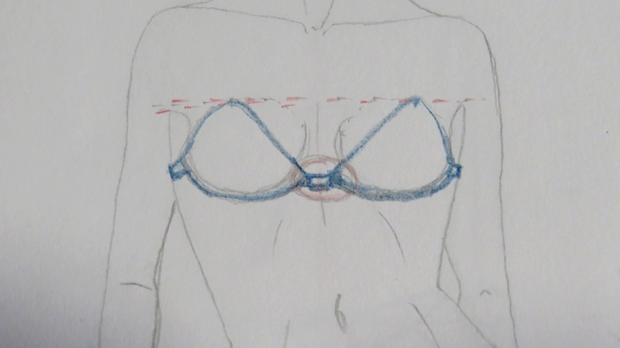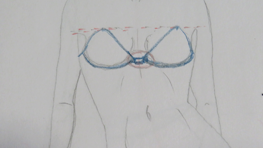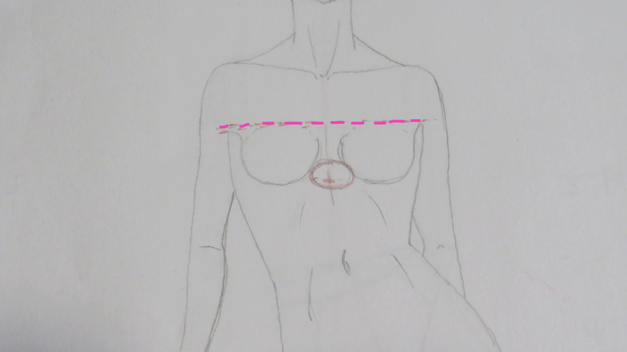 Desde la línea de altura de pecho, la cual no marqué, tenemos que situar una línea (rosa) que servirá para marcar hasta dónde llegarán las copas