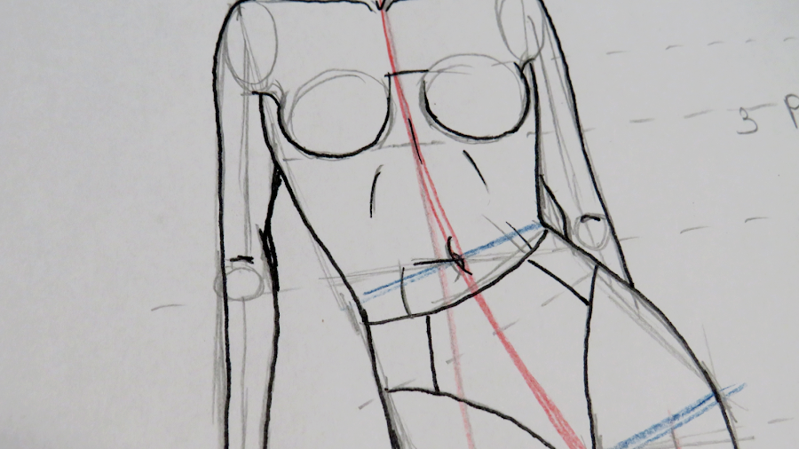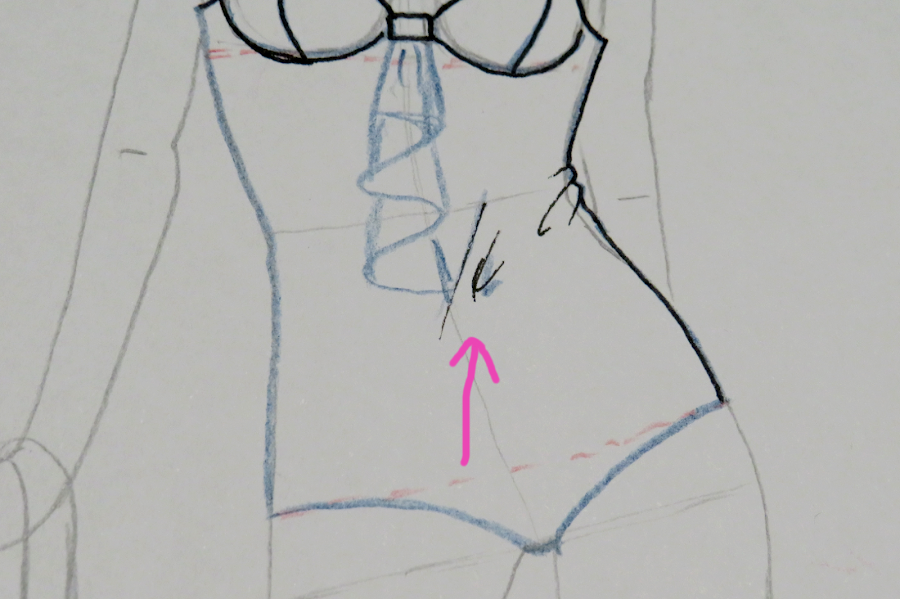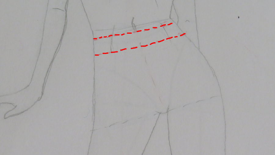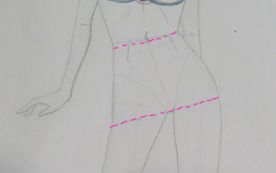 En rosa, he marcado las líneas de cintura y cadera que tenía nuestro boceto de figurín
