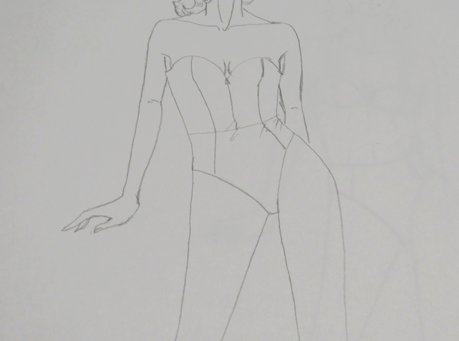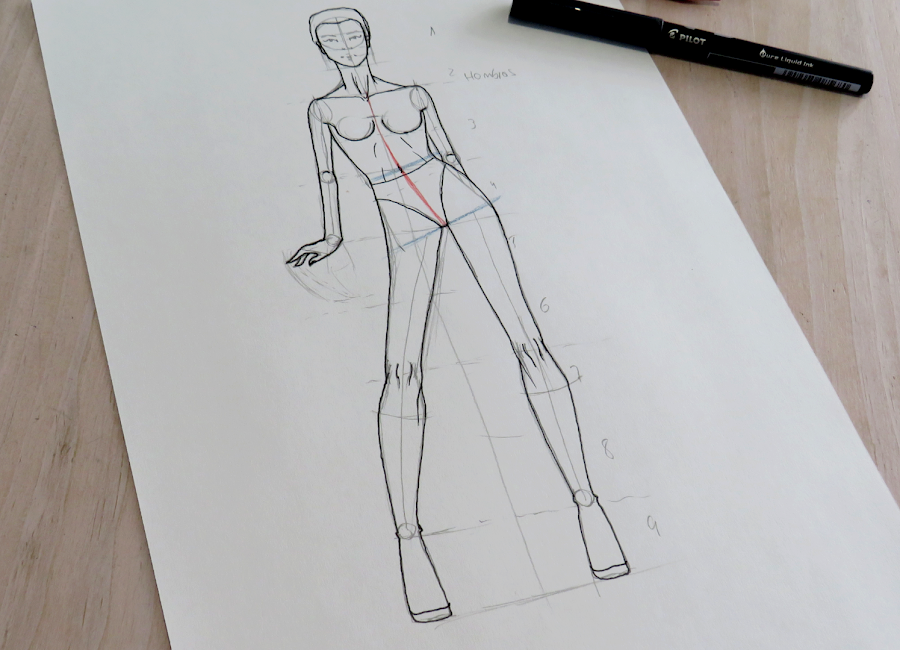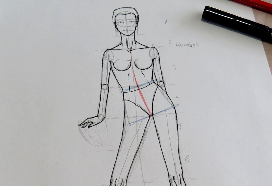 Quiero comentarte que, las plantillas de figurines que hacemos desde cero, tienen ciertas líneas que se marcan para ir haciendo el boceto del cuerpo. Es importante que conserves esas lineas, al menos mientras estas aprendiendo, ya que te serán muy útiles para ir situando este tipo de prenda