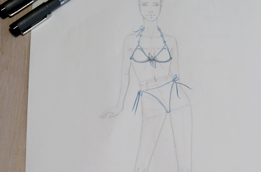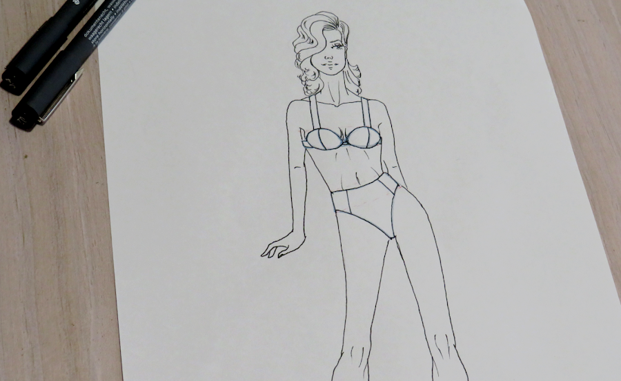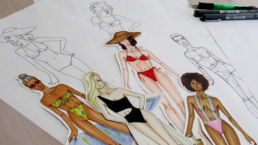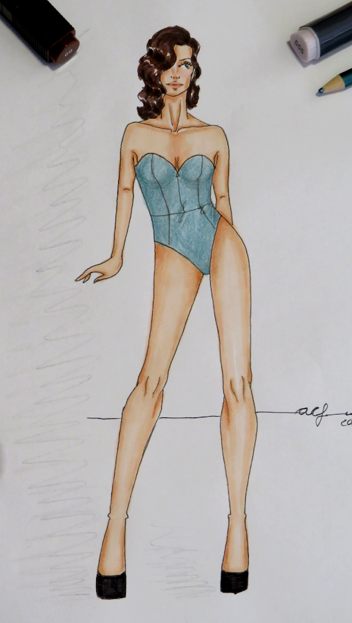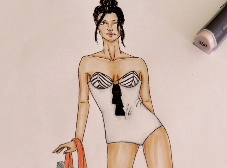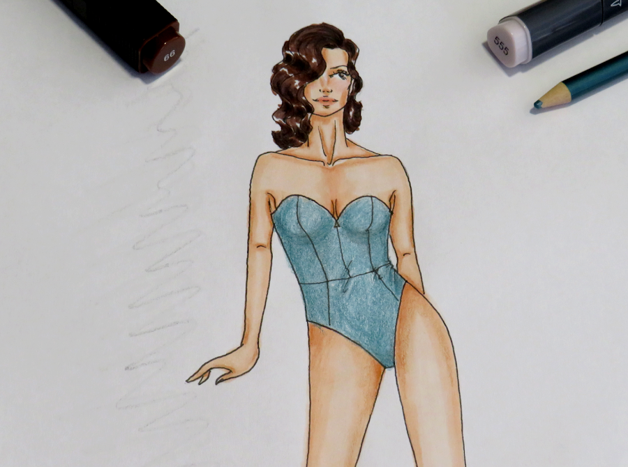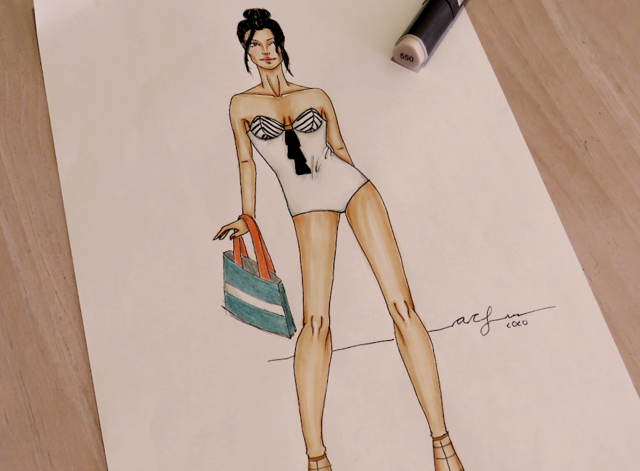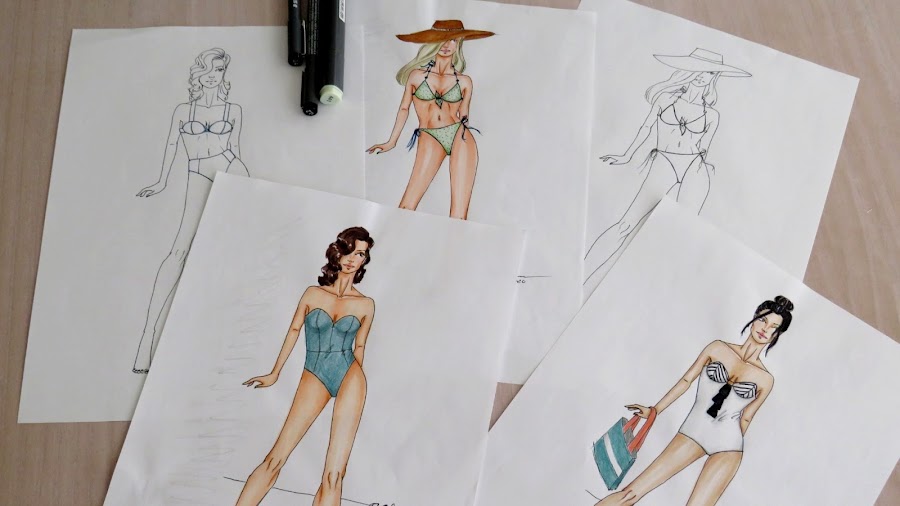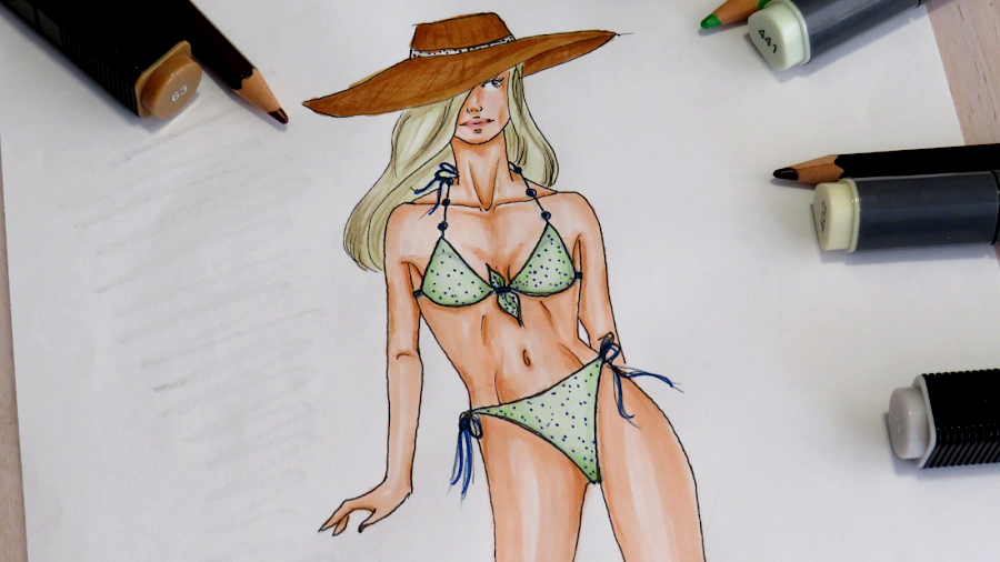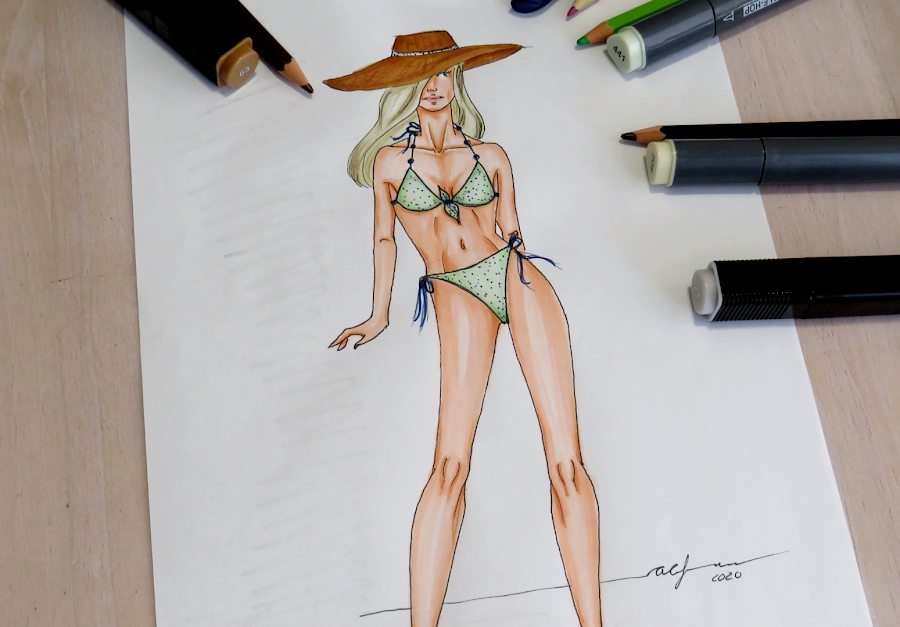 Ya sabes hacer tus diseños de trajes de baño. Ahora puedes pasar a darle color con la técnica que más te guste. A mi, personalmente, me gusta usar rotuladores a base de alcohol, tanto por su uso como por su acabado. Casi siempre los acompaño de lápices para dar ciertos detalles más intensos como, por ejemplo, las sombras.
