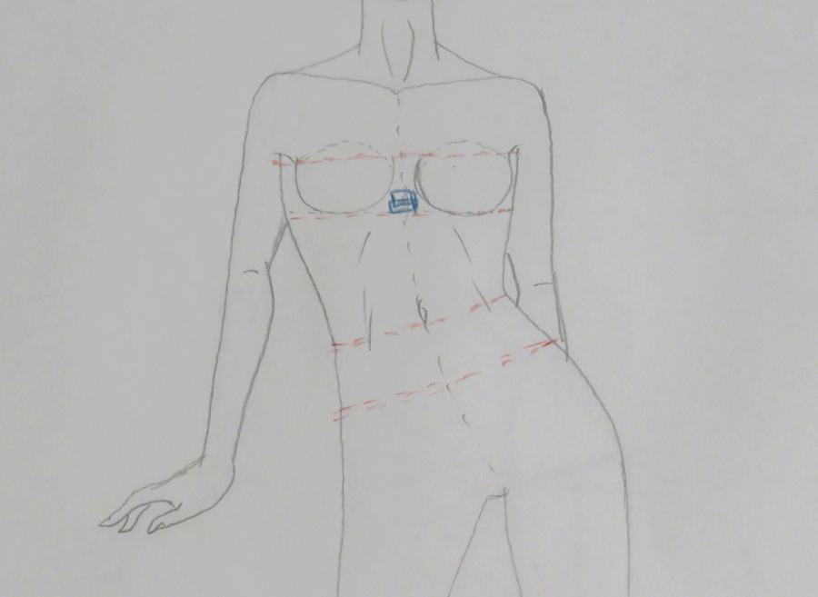 Debes de traspasar como mínimo: la línea del eje central (línea roja), la línea debajo del pecho, la línea de cintura y cadera (líneas azules)