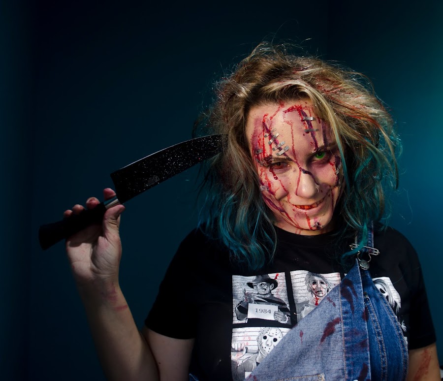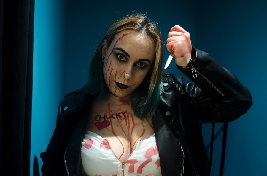 Si queréis podéis añadir sangre falsa y el falso tattoo que pone "Chucky" con un corazón.