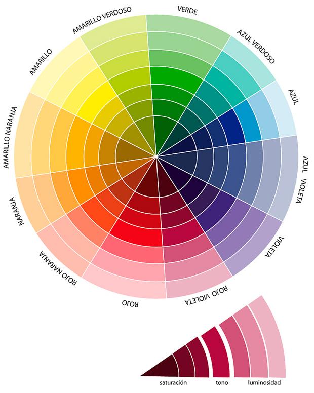 Comencemos regresando a nuestra época de colegio. ¿Cuáles son los colores primarios? Azul, rojo y amarillo. ¿Y los secundarios? Violeta, naranja y verde. Todos estos colores se sitúan en un gráfico llamado "círculo cromático", donde van mezclándose entre sí y se crean los colores terciarios, etc. Además, dependiendo de la cantidad de luz a la que esté expuesto el tono, puede aclararse u oscurecerse.