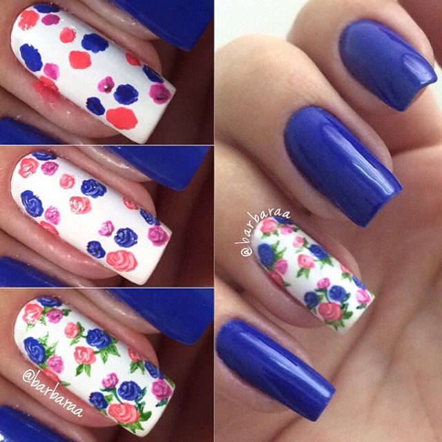 Debes escoger colores que hagan contraste con el color del esmalte con el que tenemos pintadas nuestras uñas. Por ejemplo, en este caso mi uña está pintada de color blanco mate para resaltar las rosas en color azul y rosado. Pero también puedes escoger un color negro para el fondo de la uña.