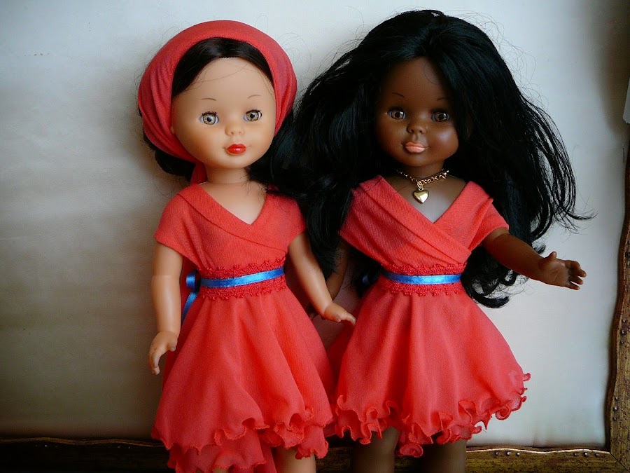 ! fijaros en estos vestidos que hice a mis muñecas , la falda tiene forma eliptica , y por lo tanto los laterales se estiran y ondulan mucho menos