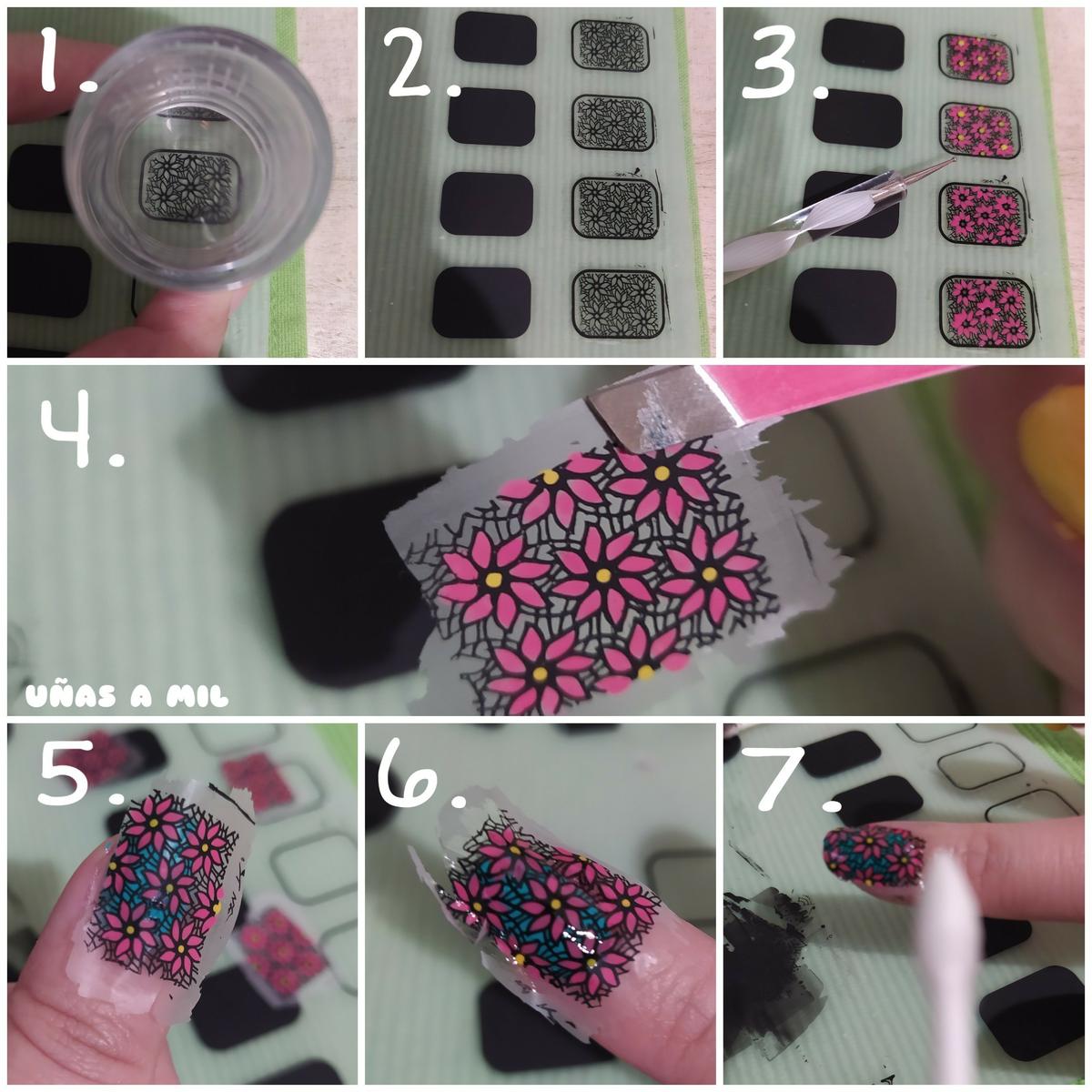 Aquí tenéis el paso a paso para realizar estas pegatinas caseras de uñas, y que os voy a explicar a continuación mas detalladamente: