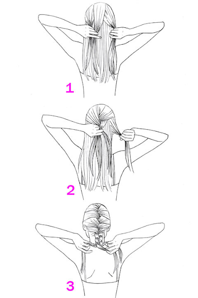 * Luego debes comenzar a entreverar los mechones, cruzándolos desde el sector derecho hacia el centro y luego desde el izquierdo hacia el centro. Antes de repetir estos movimientos debes añadir un poco de cabello del mismo sector de la cabeza, llevando los mechones hacia la parte central.