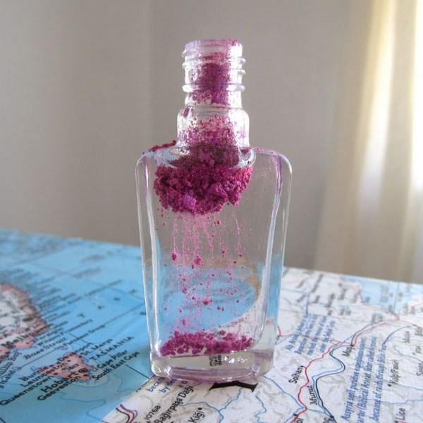 Después de esto haremos un pequeño embudo con la hoja de papel, o si tienes un embudo de este tamaño sería perfecto, es mejor poner la sombra de ojos en el esmalte transparente de esta forma para asegurarnos que entre la mayor cantidad.