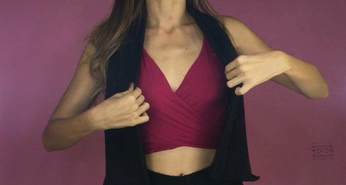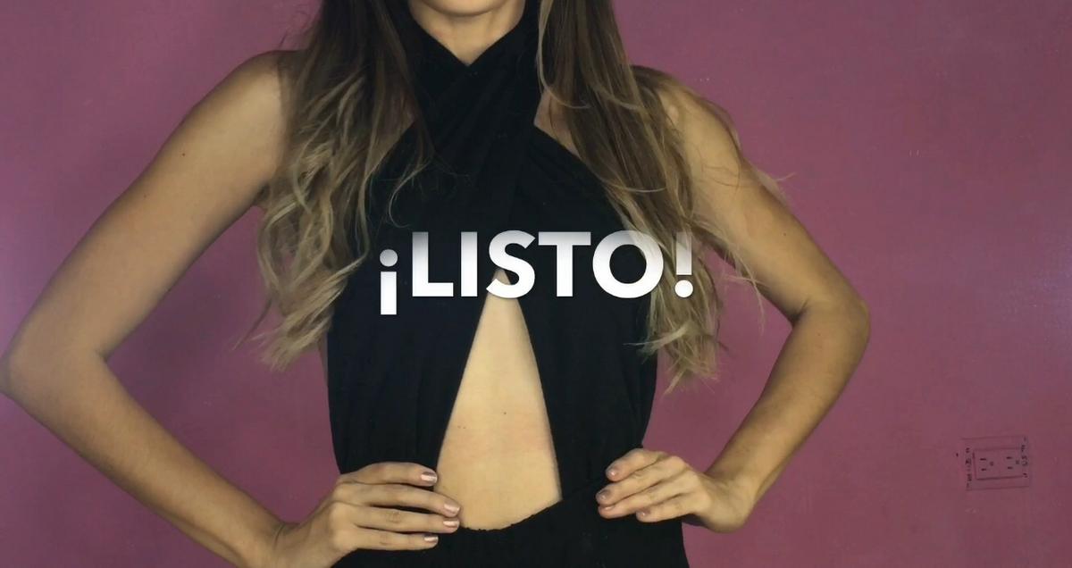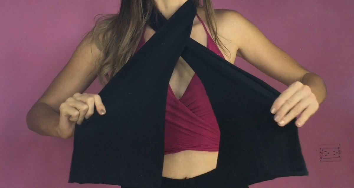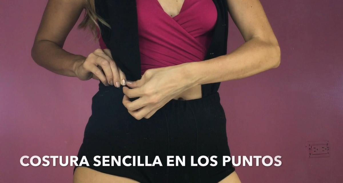 5. Ponte el short, para tener la referencia de dónde debe ir la pieza de tela larga que acabamos de coser, al pasar por el cuello realiza un cruce sencillo, asegúrate de tapar bien tus boobies y ajustar bien a la cintura. Realiza una costura sencilla en ambos extremos.