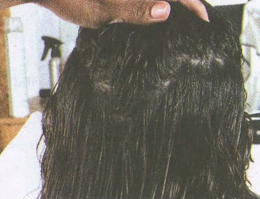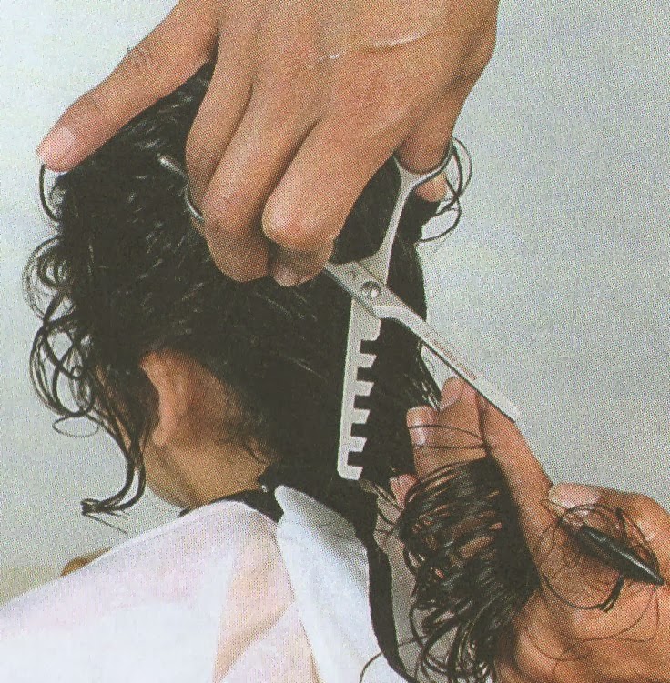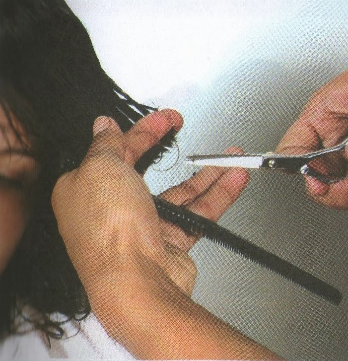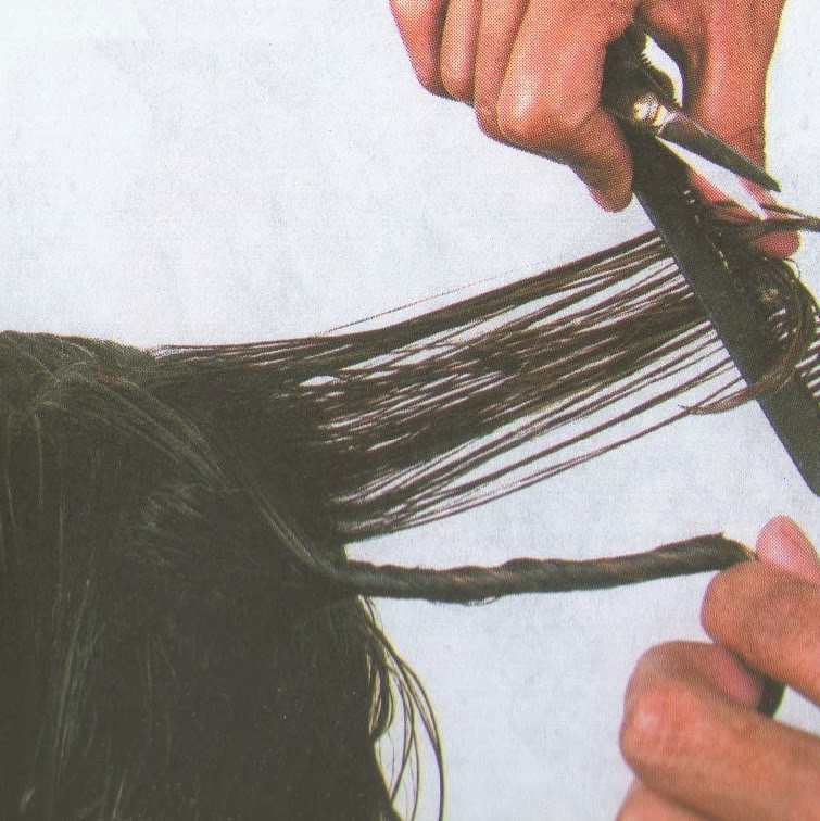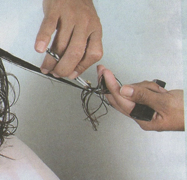 3-Llevar mechones del cabello de la nuca baja hacia el lateral para proceder a cortar a cortar en forma deshilada, de este modo se obtendrá un corte despuntado y sin volumen.