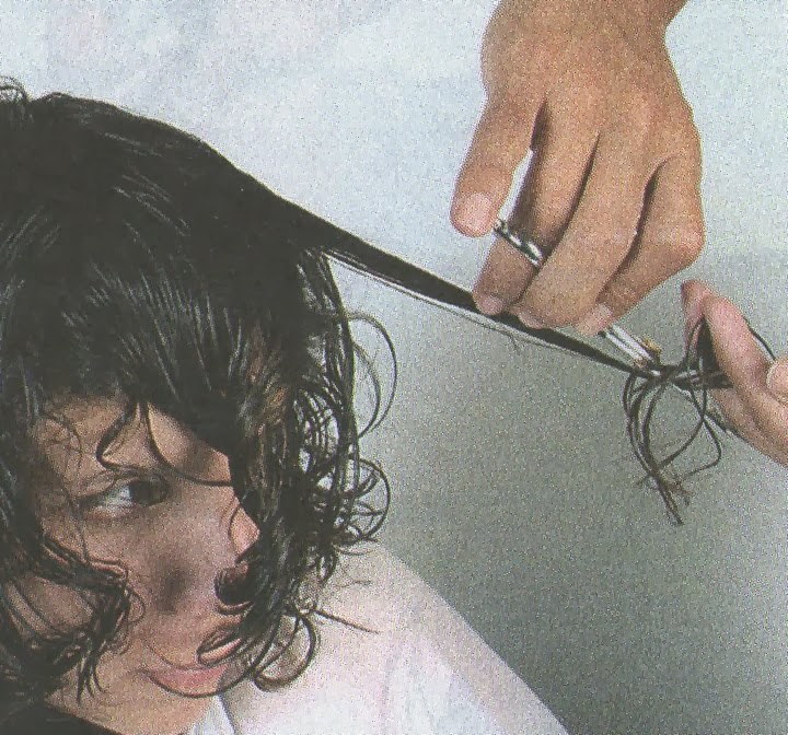 9-En la parte frontal tomar una mechón de cabello y cortar en forma diagonal y hacia abajo, de medio a apuntas.