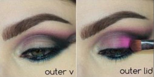 Toma el pincel ovalado y la sombra fucsia. Comienza aplicando desde el borde exterior del párpado móvil hacia el centro del ojo. Recuerda que esta sombra debes aplicarla sin deslizar el pincel sino más bien aplicando con pequeños golpecitos sobre el párpado para que se adhiera mejor el maquillaje.
