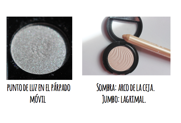 Para iluminar escogí un color plateado en el centro del párpado móvil, un tono champán muy sutil en el arco de la ceja y un tono dorado para el lagrimal.