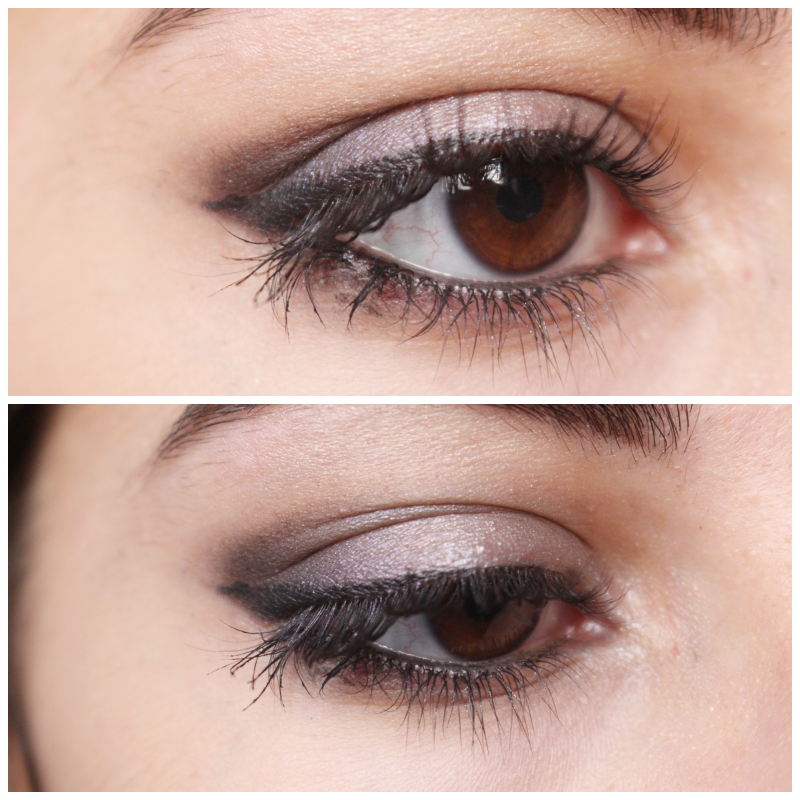 En el interior de la V (aunque solo se nota en las fotos un poco por la zona externa casi a ras de las pestañas) mezclé estos dos tonos, un azul oscuro con brillito y un morado azulito con más brillito.