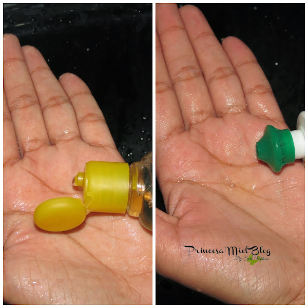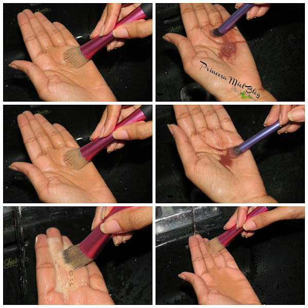 En la palma de mi mano, coloco unas gotas del jabón de fregar líquido y otras tantas del shampoo de bebé. Luego tomo la brocha y voy mezclando ambos productos en forma circular. Notarás de inmediato como va saliendo todo el maquillaje acumulado en las cerditas de tus brochas.