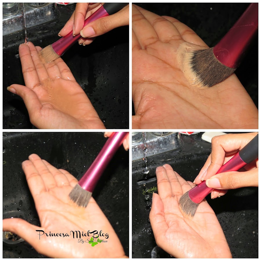 Continúo dando vueltas en forma de circulo y enjuago con un chorrito de agua directo del grifo teniendo cuidado que el agua no llegue hasta la parte plateada donde inician las cerdas pues si les entra agua allí es difícil de sacar.