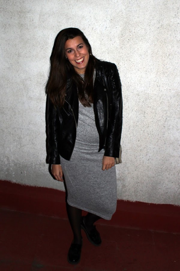 Hoy os traigo el outfit de ayer, ya que trabaje hasta tarde y me hice las fotos de noche..! La pieza principal del look es este vestido gris de Stradivarius (15.99€) que yo buscaba hacia tiempo pero con punto de canalé, que pasa que este era más barato y me compre este. Es un vestido ceñido, que yo no estoy acostumbrada a llevar, pero me gustan este estilo de vestidos. Lo combiné con mi cazadora de polipiel negra de H&M, medias negras y los mocasines negros también de Stradivarius.