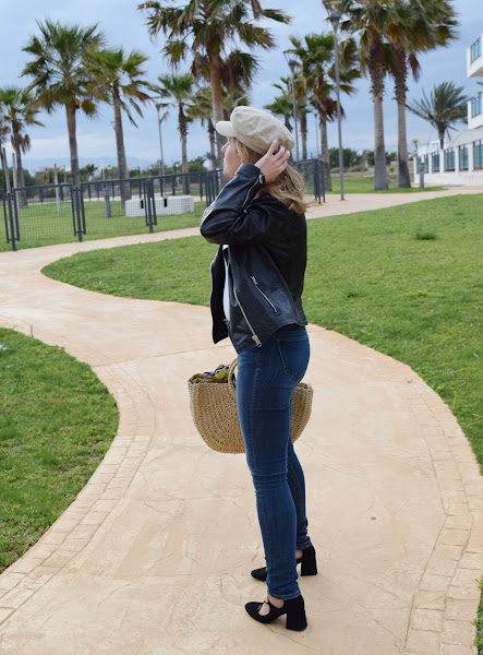 En este caso una gorra, pendientes de flecos y bolso tipo capazo, los tres en tonos beige y neutros que aportan el toque alegre para este look primaveral con biker.