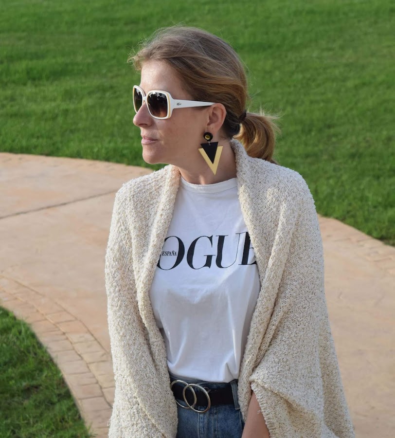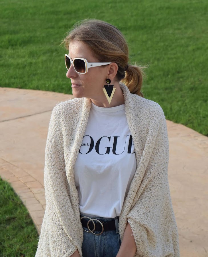 Nada más sencillo que una camiseta blanca con una chaqueta larga, una de mis favoritas con pequeñas lentejuelas, que compré en los inicios del blog, con pequeñas mini lentejuelas que la hacen apta en cualquier momento del día.