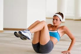 3. Echada boca arriba con las piernas flexionadas y las manos detrás de la nuca. Trata de llevar tu codo izquierdo hacia la rodilla derecha y viceversa, intentando concentrar el esfuerzo en el estómago y nó en el cuello.