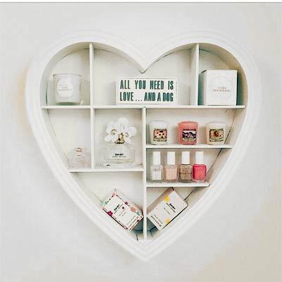 Como veis hay ideas para todos los gustos, todos los bolsillos y todas las colecciones. Quizá la elección depende más del tamaño de la colección de maquillaje que tengamos, que de lo que nos atraiga en sí el método de almacenamiento. Por eso os quiero enseñar algunas ideas más, todas variadas, que personalmente me han gustado para las diferentes colecciones y usos… a ver si coincidís conmigo. A mí, la estantería chiquitita en forma de corazón, aunque me resulta de lo más escaso… me vuelve loca, no lo puedo evitar. Es que me sale la vena romántica hasta por las orejas, chicas jajaja