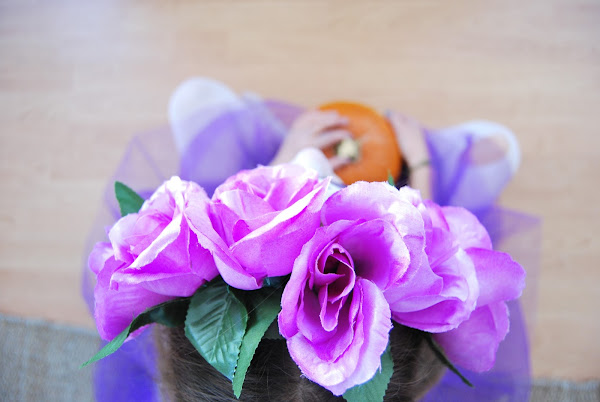 Sólo necesitamos una corona de flores grandes. Como las que venden en tiendas de disfraces son de flores pequeñas, fabricamos la nuestra con un ramo de flores artificiales que compramos en un bazar chino y una cinta elástica, vale cualquier flor, la gracia es que sean lo más grandes posibles: