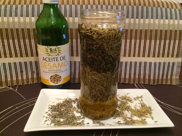 Al aceite de sésamo le he añadido flores secas de lavanda porque tiene propiedades tónicas y además su fragancia se utiliza para combatir el estrés y hojas secas de romero que protege frente a la oxidación.