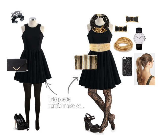 1- Escoge un vestido versátil: Hay muchas clases de vestidos, unos más llamativos que otros. Los de Nochevieja pueden ser muy distintos: anchos, ajustados, con vuelo, de lentejuelas, dorados, con puntitos, brillantes... Pero para reinventar uno lo que necesitamos es un modelo que sea versátil, es decir, que tenga lo menos posible para poder moldearlo a nuestro antojo. También vale con una falda y un pantalón, pero creo que es más sencillo con un vestido, ya que la falda con cambiar de combinación vale, y lo mismo con el pantalón y la blusa.