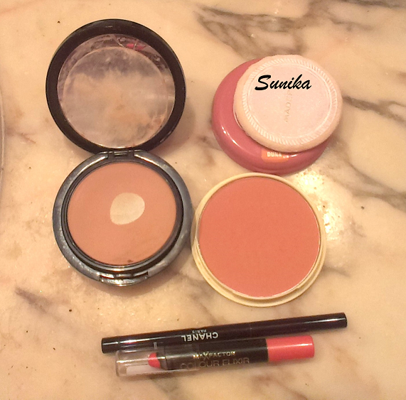 En mi caso como base usé un compacto de ArtDeco que me controla muy bien los brillos y que después de aplicado queda con un aspecto como empolvado. Para el lineado interior del parpado superior utilicé un lápiz waterproof de Chanel. Para las mejillas el Dune de Maderas y para los labios un labial de MaxFactor.