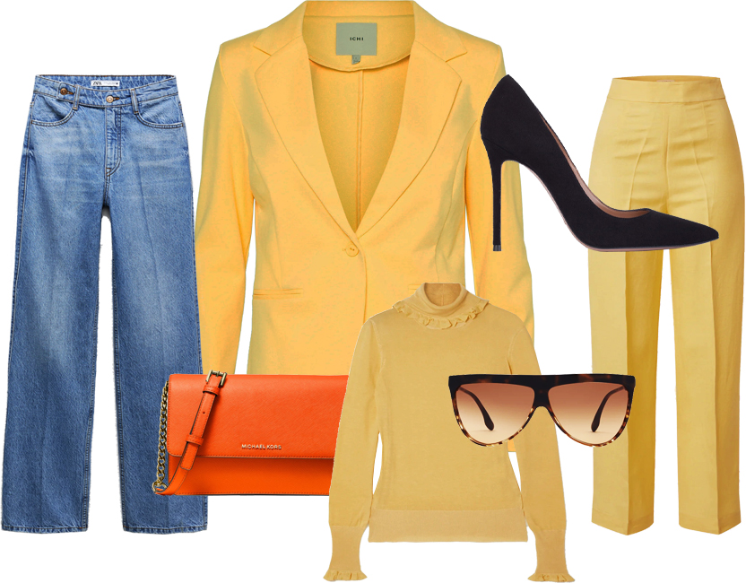 De izquierda a derecha: Pantalón vaquero, Zara (29.95€) Americana amarilla, ICHI (39.95€) Bandolera de piel naranja, Michael Michael Kors (90.00€) Salones negros, Pura López (230.00€) Jersey de punto con volantes, Victoria Beckham (207.00€) Pantalón de pinzas amarillo, EDITED (34.90€) Gafas de sol print carey, Victoria Beckham (260.00€)