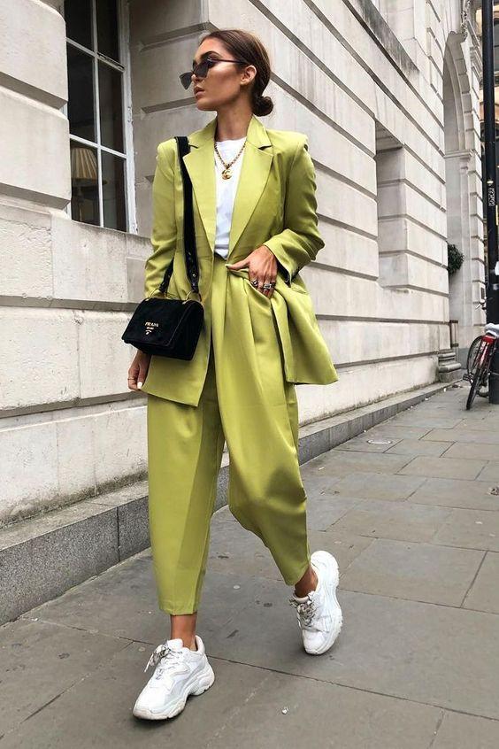 Algo que también me gusta mucho de esta moda es que no hay actividad especifica para llevarlos, podemos elegir un traje sastre de mujer para ir a trabajar pero podemos combinarlo con zapatillas deportivas o tenis y romper con lo establecido.