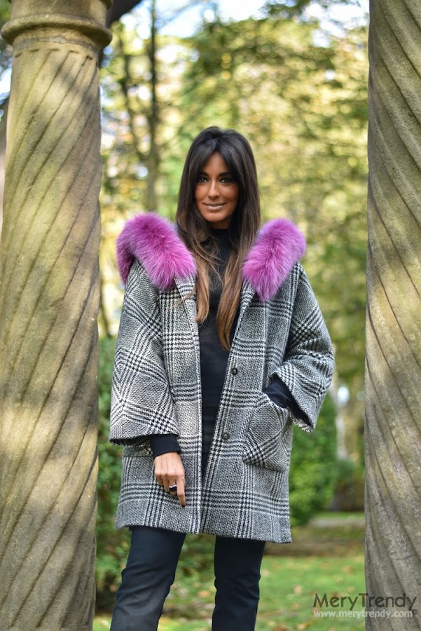 La nota de color, la pone el pelito de la capucha, el cual, además de súper bonita, la hace de lo más especial, ¿verdad? Creo que su llamativa tonalidad contrasta a la perfección con la sobriedad propia de una prenda de tales características (haciendo que destaque más, si cabe) y también con el total black de fondo que me he marcado debajo que, como ya sabéis, me resulta una opción infalible cuando no quiero arriesgar en exceso. Y es que una tonalidad neutra es ideal para crear un total look que encaje con el frío del invierno, ¿a que sí?. Asimismo, es un color elegante y sofisticado con el que es muy fácil combinar estampados como la pata de gallo. Sin duda, una combinación ganadora, ¿no os parece?