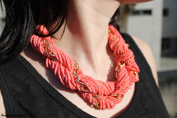 Los combiné con camiseta básica con lazos coral en la espalda, sandalias joya, collar a juego con la camiseta, bolso negro y para la tarde-noche que refrescaba una chaqueta denim.