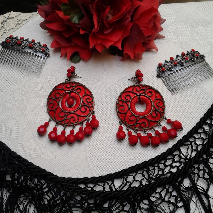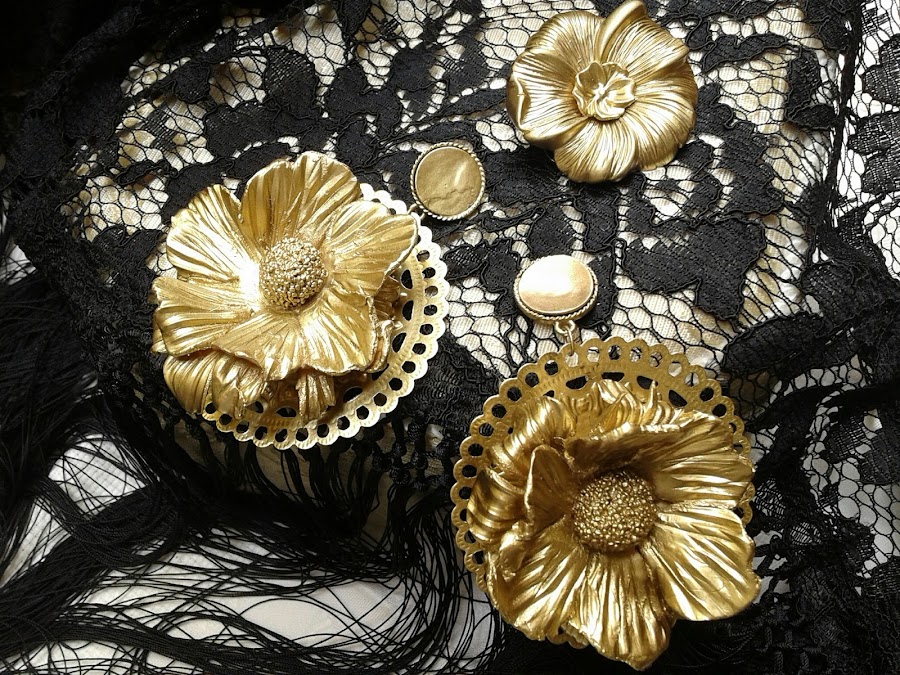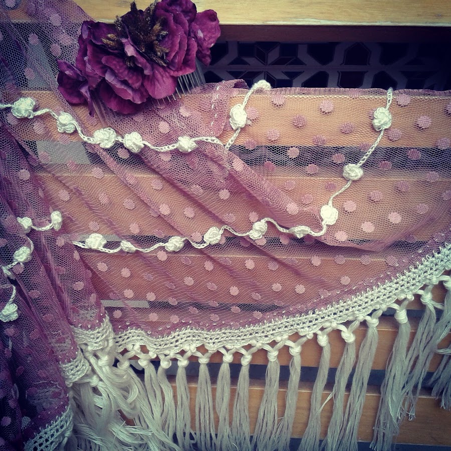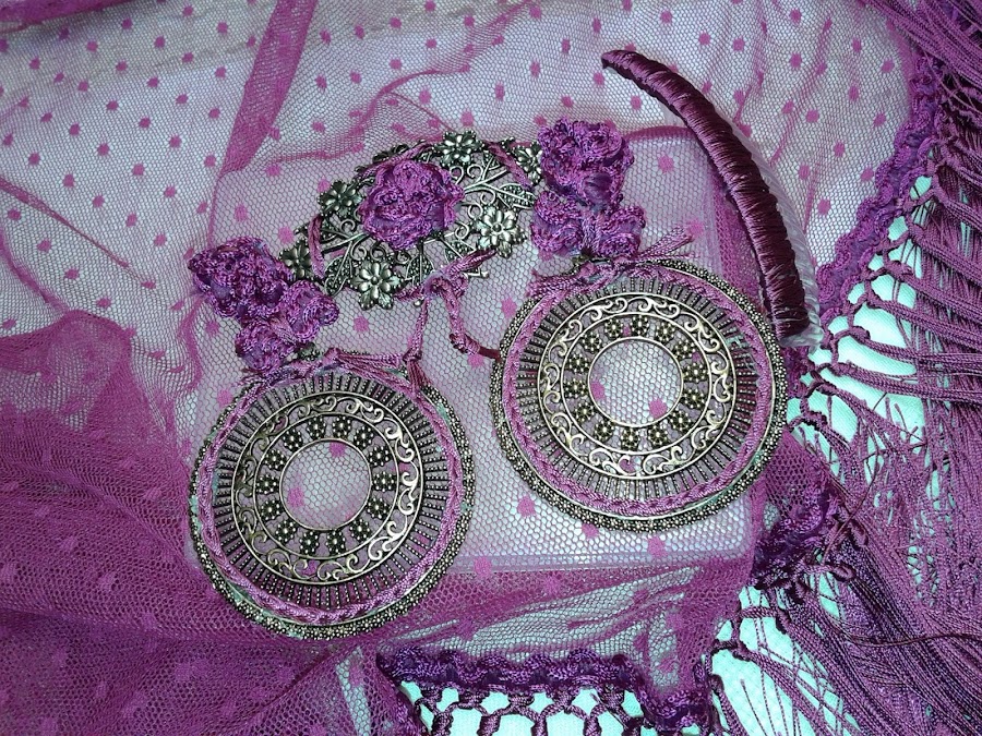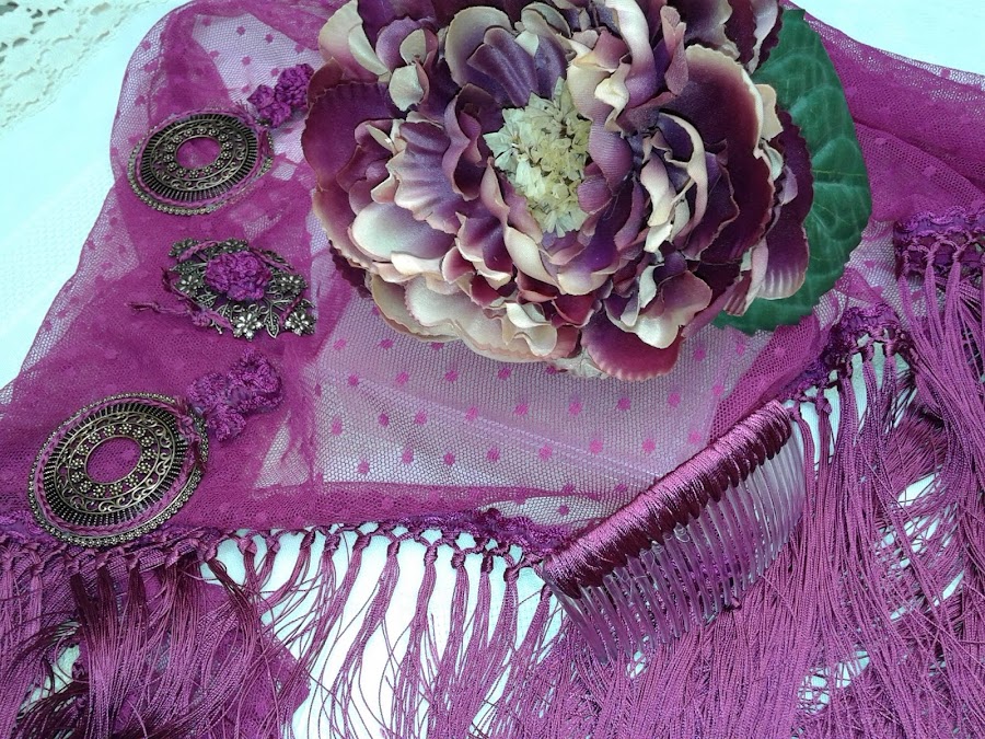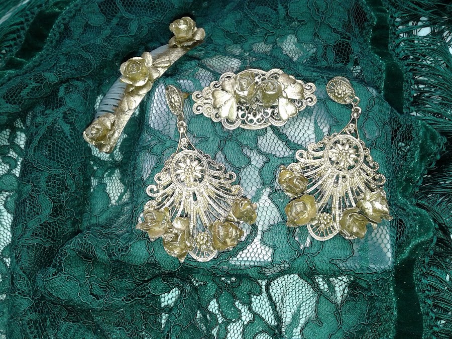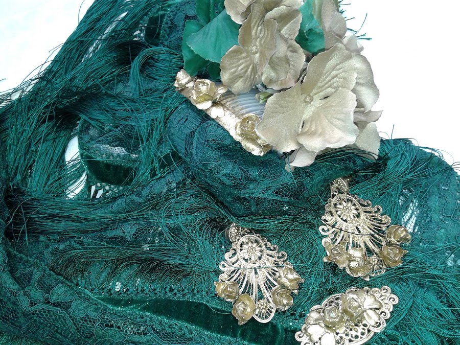 Para completar el traje he realizado un mantoncillo del mismo tono a juego . Y los complementos los realice en dorados para que destacasen del traje también la flor està realizada para este traje.