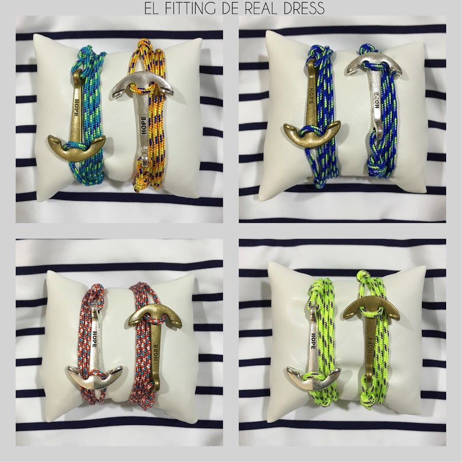 Pulseras: con apliques metálicos de motivos marineros, como pueden ser anclas, timones, anzuelos... anudados en cordones náuticos, coloridos...muy bonitos para esta época (en este caso muestro las fotos de las que hago yo, espero que os gusten).