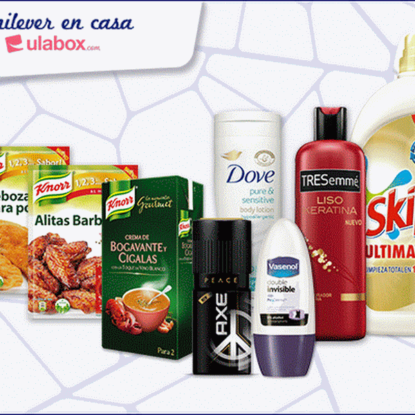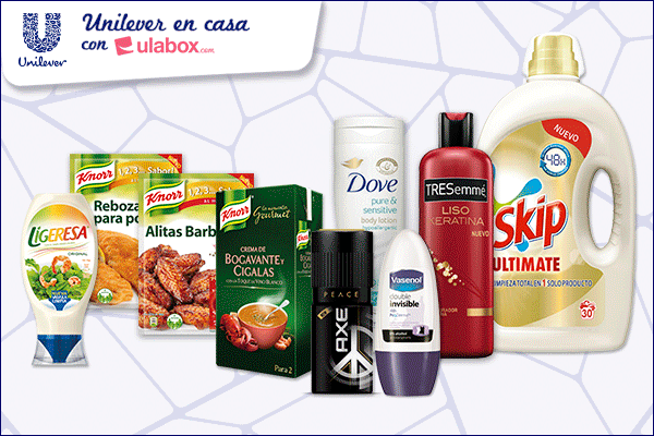 Lo bueno es que Unilever nos lo pone más fácil todavía y lanza ?Unilever en casa con Ulabox?, una tienda online que con productos de sus numerosas marcas de alimentación, cuidado personal y cuidado del hogar. 400 marcas de todo el mundo, como TresEmmé, Pond?s Institute, Moussel, Flora, Calvé, Lipton, etc. Y por comprar superiores a 25 euros el envío es gratuito.