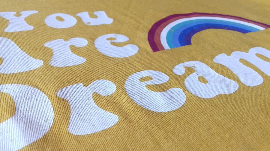Las letras y arcoiris están un poco desgastados. El amarillo es precioso.
