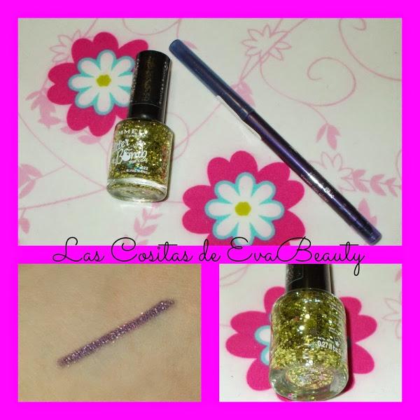 (Esmalte glitter Rimmel y delineador violeta glitter de Deliplús por Las Cositas de EvaBeauty)