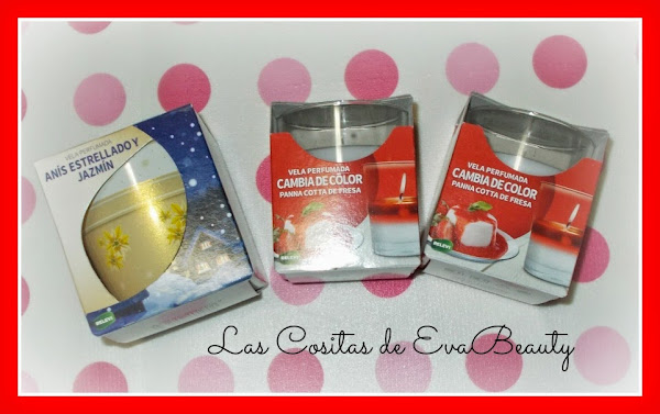 Otro día que estaba por Mercadona, cogí éstas 3 velas, una és de anís estrellado y jazmín y las otras 2 son iguales, de panacotta de fresa y cambian de color.