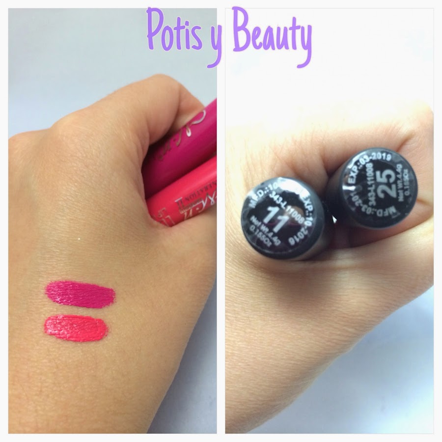 Me encantan!! pero pensé que eran mas oscuros... me tengo que acostumbrar a verme con colores potentes... y además es fácil salirte del labio, cuidado chicas!!! y de verdad que cuesta quitarlo! El rosa es el 11 y el morado el 25. Cuestan 1,21$ al cambio 0,88? cada uno. link: http://www.buyincoins.com/item/39656.html#.U49wlvl_uSo